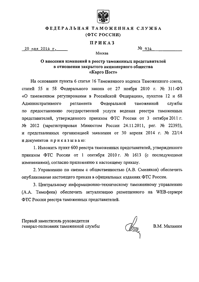 ПРИКАЗ ФТС РФ от 20.05.2014 N 934