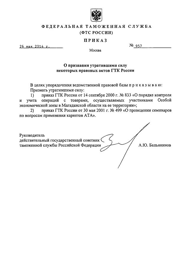ПРИКАЗ ФТС РФ от 26.05.2014 N 957