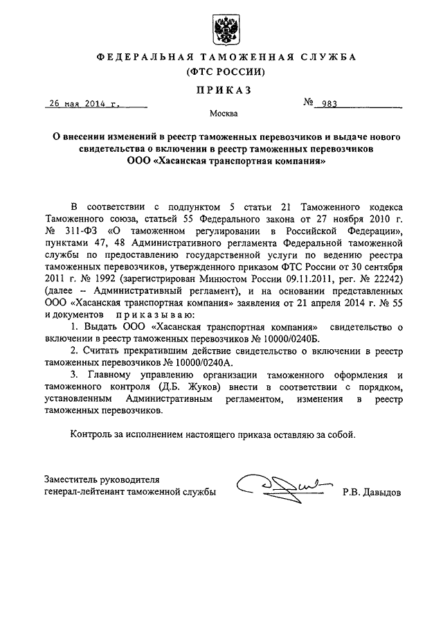 "О ВНЕСЕНИИ ИЗМЕНЕНИЙ В РЕЕСТР ТАМОЖЕННЫХ ПЕРЕВОЗЧИКОВ И ВЫДАЧЕ НОВОГО СВИДЕТЕЛЬСТВА О ВКЛЮЧЕНИИ В РЕЕСТР ТАМОЖЕННЫХ ПЕРЕВОЗЧИКОВ ООО "ХАСАНСКАЯ ТРАНСПОРТНАЯ КОМПАНИЯ"