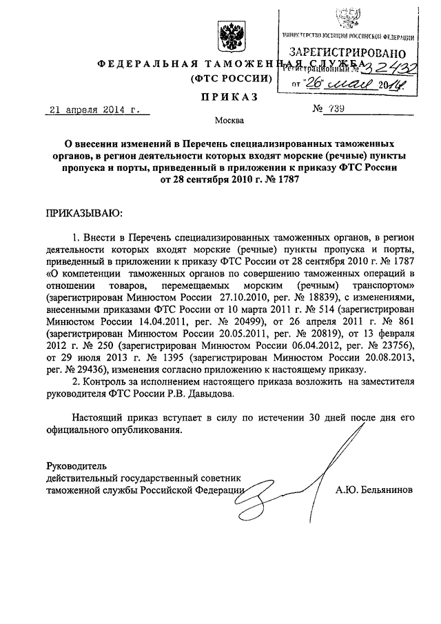 ПРИКАЗ ФТС РФ от 21.04.2014 N 739