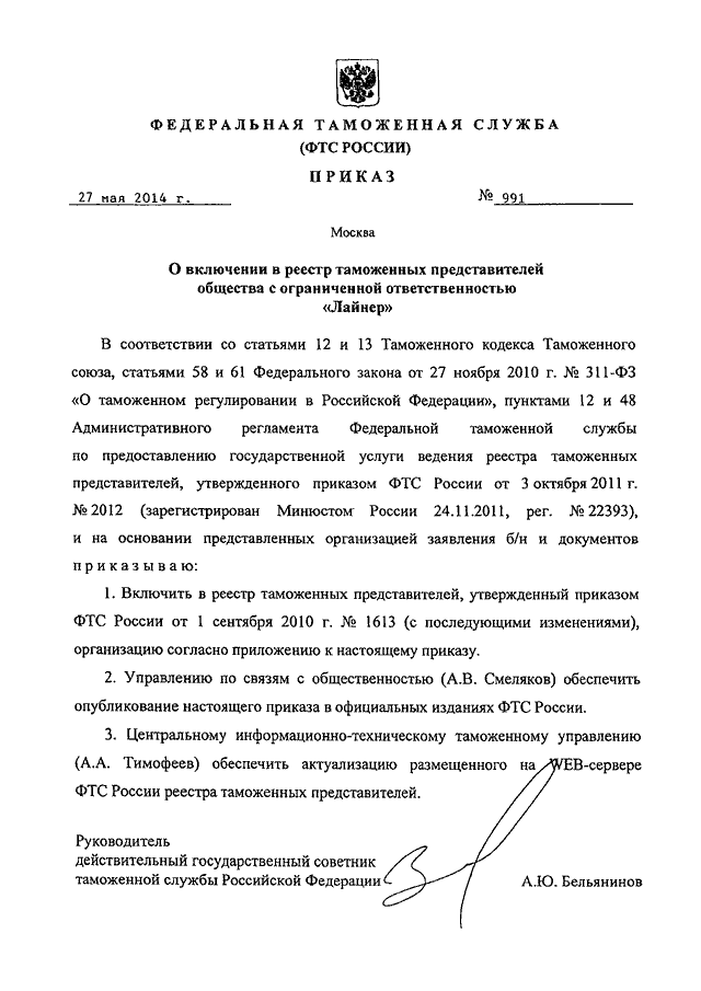 ПРИКАЗ ФТС РФ от 27.05.2014 N 991