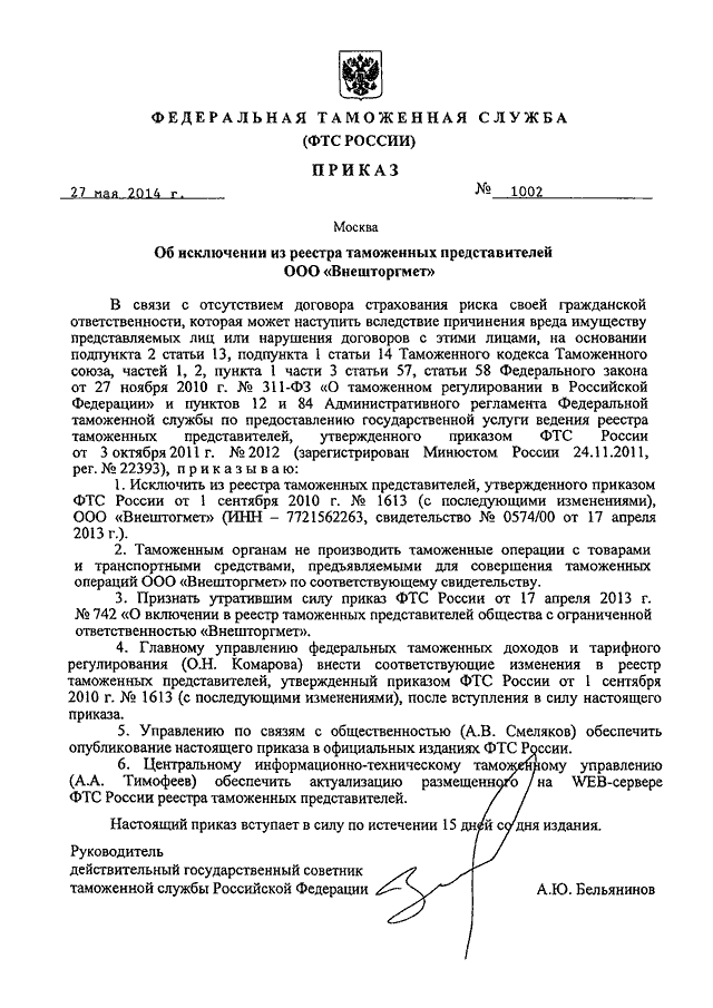 ПРИКАЗ ФТС РФ от 27.05.2014 N 1002