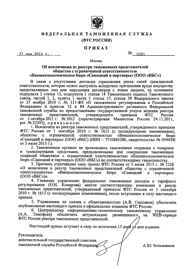 ПРИКАЗ ФТС РФ от 27.05.2014 N 1001
