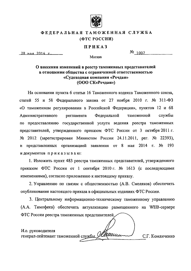 ПРИКАЗ ФТС РФ от 28.05.2014 N 1007