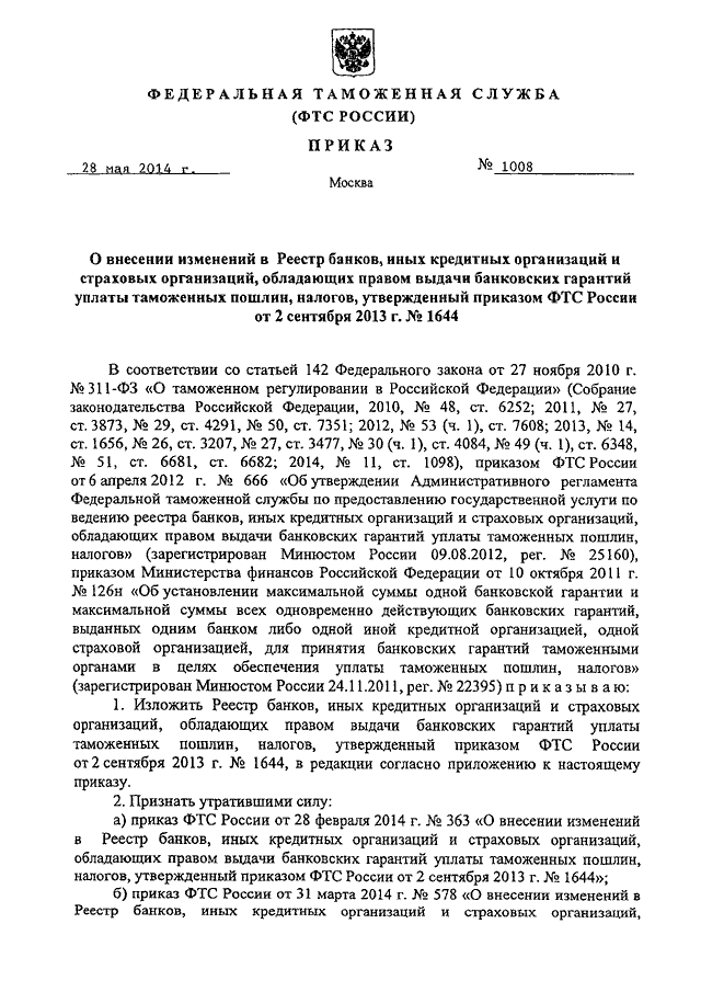 ПРИКАЗ ФТС РФ от 28.05.2014 N 1008