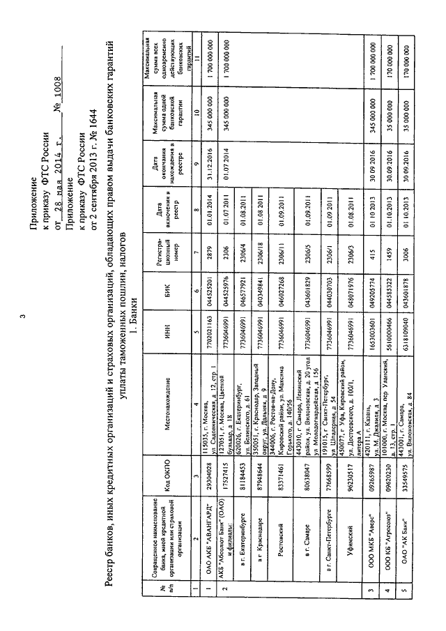 "О ВНЕСЕНИИ ИЗМЕНЕНИЙ В РЕЕСТР БАНКОВ, ИНЫХ КРЕДИТНЫХ ОРГАНИЗАЦИЙ И СТРАХОВЫХ ОРГАНИЗАЦИЙ, ОБЛАДАЮЩИХ ПРАВОМ ВЫДАЧИ БАНКОВСКИХ ГАРАНТИЙ УПЛАТЫ ТАМОЖЕННЫХ ПОШЛИН, НАЛОГОВ, УТВЕРЖДЕННЫЙ ПРИКАЗОМ ФТС РОССИИ ОТ 2 СЕНТЯБРЯ 2013 Г. N 1644"