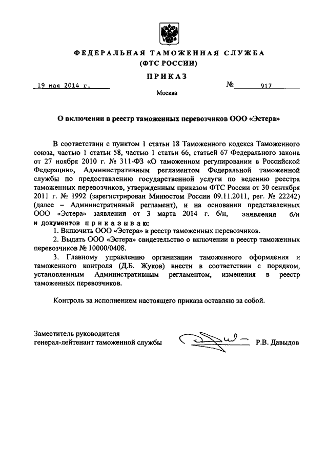ПРИКАЗ ФТС РФ от 19.05.2014 N 917