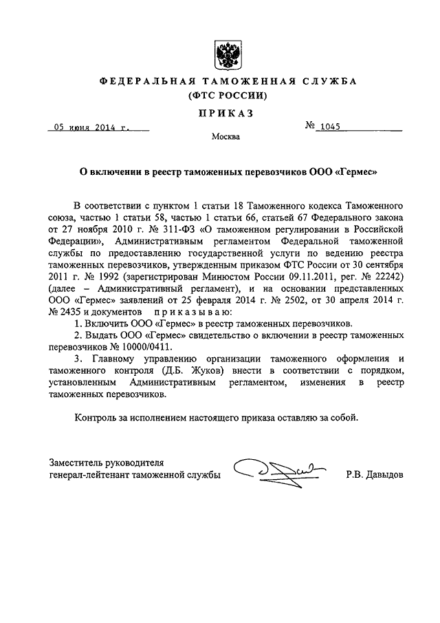 "О ВКЛЮЧЕНИИ В РЕЕСТР ТАМОЖЕННЫХ ПЕРЕВОЗЧИКОВ ООО "ГЕРМЕС"