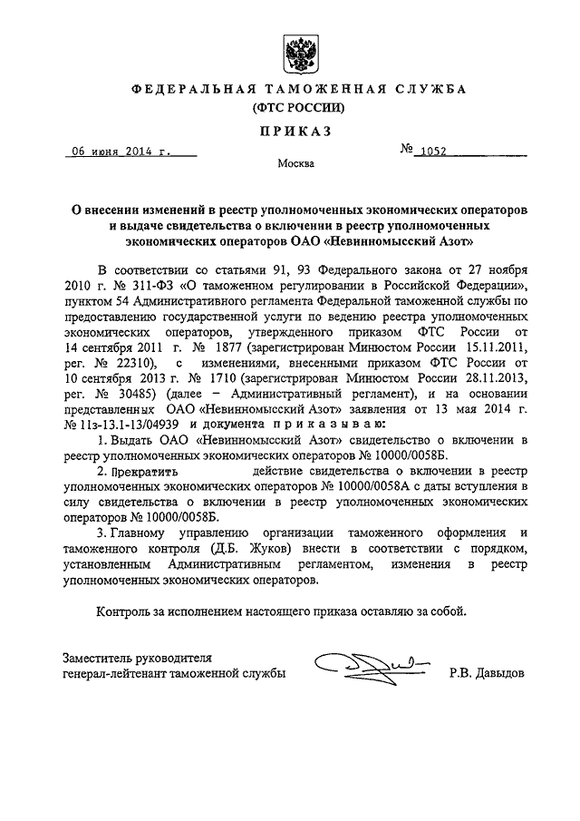 "О ВНЕСЕНИИ ИЗМЕНЕНИЙ В РЕЕСТР УПОЛНОМОЧЕННЫХ ЭКОНОМИЧЕСКИХ ОПЕРАТОРОВ И ВЫДАЧЕ СВИДЕТЕЛЬСТВА О ВКЛЮЧЕНИИ В РЕЕСТР УПОЛНОМОЧЕННЫХ ЭКОНОМИЧЕСКИХ ОПЕРАТОРОВ ОАО "НЕВИННОМЫССКИЙ АЗОТ"