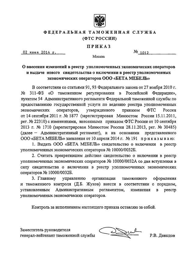 "О ВНЕСЕНИИ ИЗМЕНЕНИЙ В РЕЕСТР УПОЛНОМОЧЕННЫХ ЭКОНОМИЧЕСКИХ ОПЕРАТОРОВ И ВЫДАЧЕ НОВОГО СВИДЕТЕЛЬСТВА О ВКЛЮЧЕНИИ В РЕЕСТР УПОЛНОМОЧЕННЫХ ЭКОНОМИЧЕСКИХ ОПЕРАТОРОВ ООО "БЕТА МЕБЕЛЬ"