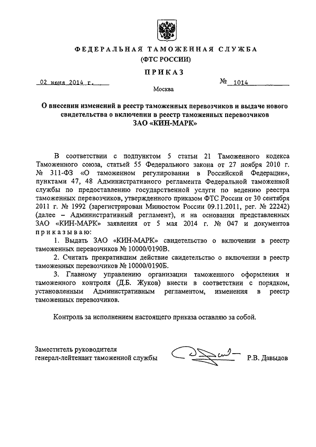 "О ВНЕСЕНИИ ИЗМЕНЕНИЙ В РЕЕСТР ТАМОЖЕННЫХ ПЕРЕВОЗЧИКОВ И ВЫДАЧЕ НОВОГО СВИДЕТЕЛЬСТВА О ВКЛЮЧЕНИИ В РЕЕСТР ТАМОЖЕННЫХ ПЕРЕВОЗЧИКОВ ЗАО "КИН-МАРК"