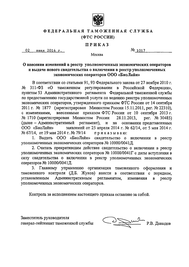 "О ВНЕСЕНИИ ИЗМЕНЕНИЙ В РЕЕСТР УПОЛНОМОЧЕННЫХ ЭКОНОМИЧЕСКИХ ОПЕРАТОРОВ И ВЫДАЧЕ НОВОГО СВИДЕТЕЛЬСТВА О ВКЛЮЧЕНИИ В РЕЕСТР УПОЛНОМОЧЕННЫХ ЭКОНОМИЧЕСКИХ ОПЕРАТОРОВ ООО "БИОЛАЙН"