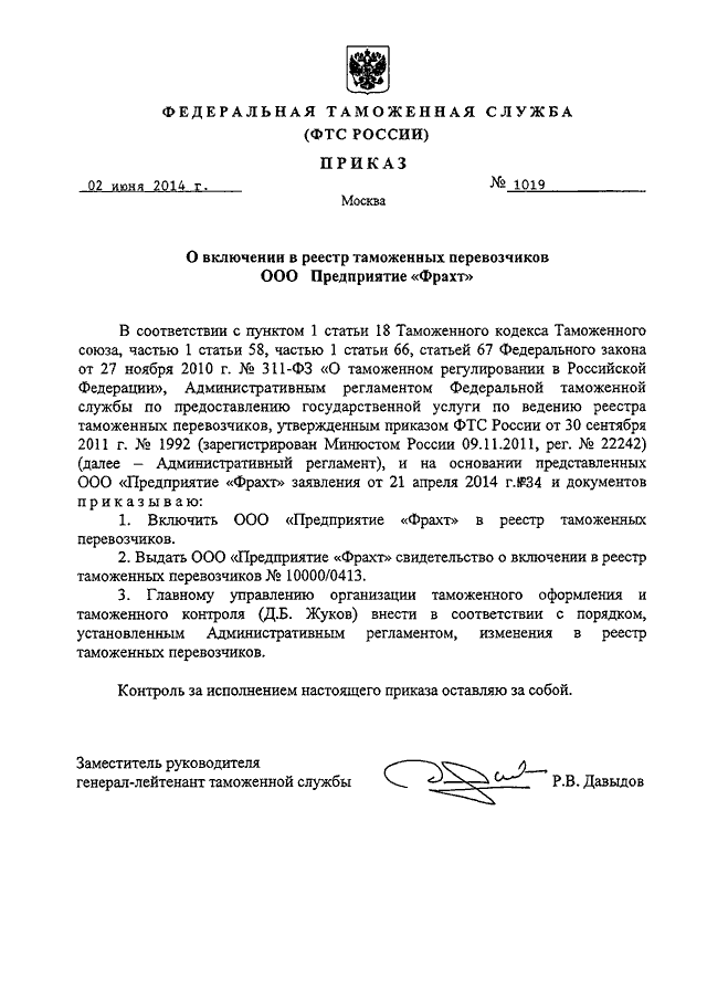 "О ВКЛЮЧЕНИИ В РЕЕСТР ТАМОЖЕННЫХ ПЕРЕВОЗЧИКОВ ООО ПРЕДПРИЯТИЕ "ФРАХТ"