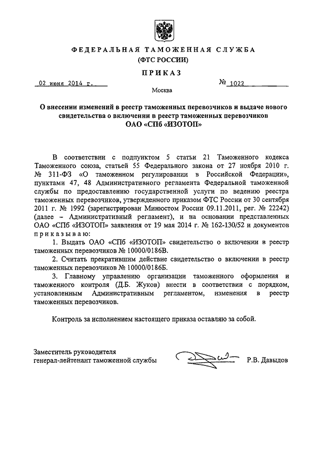 ПРИКАЗ ФТС РФ от 02.06.2014 N 1022