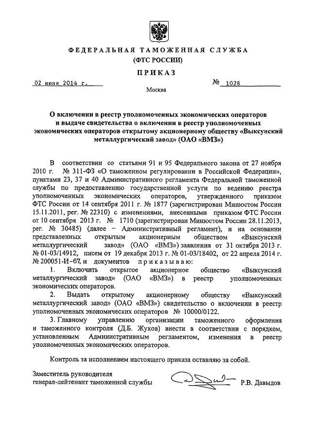 ПРИКАЗ ФТС РФ от 02.06.2014 N 1028 "О ВКЛЮЧЕНИИ В РЕЕСТР УПОЛНОМОЧЕННЫХ ЭКОНОМИЧЕСКИХ ОПЕРАТОРОВ И