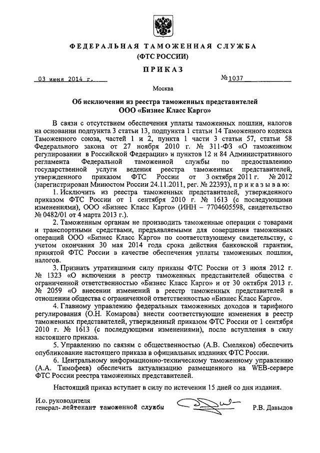 ПРИКАЗ ФТС РФ от 03.06.2014 N 1037