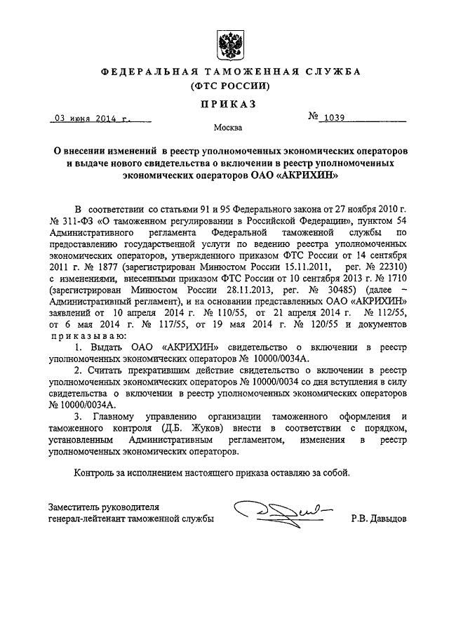 "О ВНЕСЕНИИ ИЗМЕНЕНИЙ В РЕЕСТР УПОЛНОМОЧЕННЫХ ЭКОНОМИЧЕСКИХ ОПЕРАТОРОВ И ВЫДАЧЕ НОВОГО СВИДЕТЕЛЬСТВА О ВКЛЮЧЕНИИ В РЕЕСТР УПОЛНОМОЧЕННЫХ ЭКОНОМИЧЕСКИХ ОПЕРАТОРОВ ОАО "АКРИХИН"