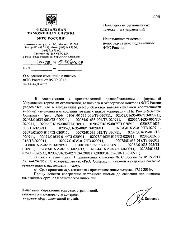 ПИСЬМО ФТС РФ от 13.05.2014 N 14-40/21637