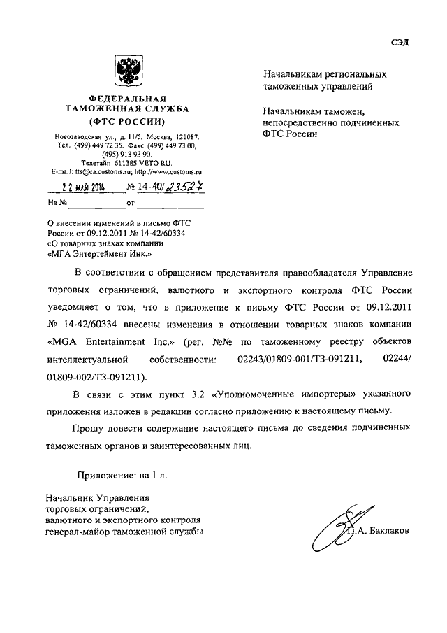 "О ВНЕСЕНИИ ИЗМЕНЕНИЙ В ПИСЬМО ФТС РОССИИ ОТ 09.12.2011 N 14-42/60334 "О ТОВАРНЫХ ЗНАКАХ КОМПАНИИ "МГА ЭНТЕРТЕЙМЕНТ ИНК."