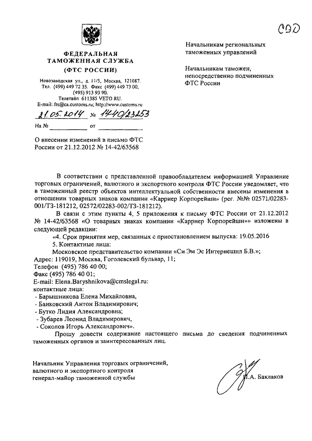 "О ВНЕСЕНИИ ИЗМЕНЕНИЙ В ПИСЬМО ФТС РОССИИ ОТ 21.12.2012 N 14-42/63568"