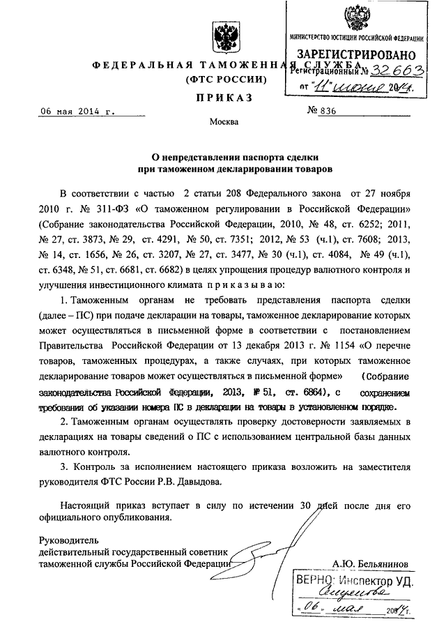 ПРИКАЗ ФТС РФ от 06.05.2014 N 836