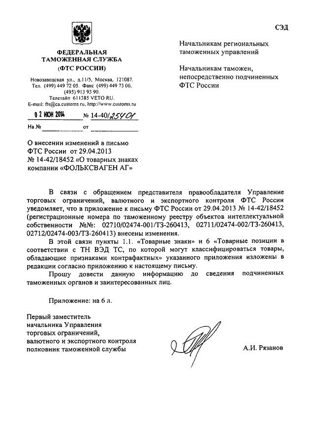 "О ВНЕСЕНИИ ИЗМЕНЕНИЙ В ПИСЬМО ФТС РОССИИ ОТ 29.04.2013 N 14-42/18452 "О ТОВАРНЫХ ЗНАКАХ КОМПАНИИ "ФОЛЬКСВАГЕН АГ"