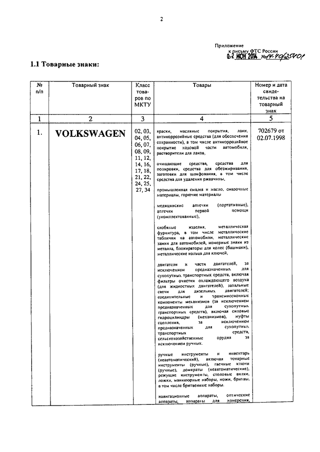 "О ВНЕСЕНИИ ИЗМЕНЕНИЙ В ПИСЬМО ФТС РОССИИ ОТ 29.04.2013 N 14-42/18452 "О ТОВАРНЫХ ЗНАКАХ КОМПАНИИ "ФОЛЬКСВАГЕН АГ"