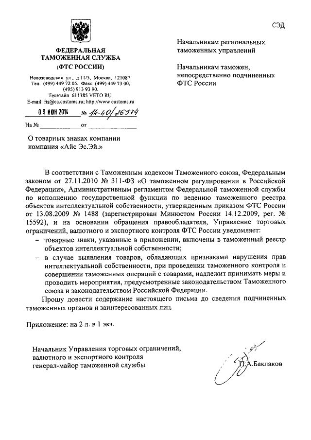 ПИСЬМО ФТС РФ от 09.06.2014 N 14-40/26574