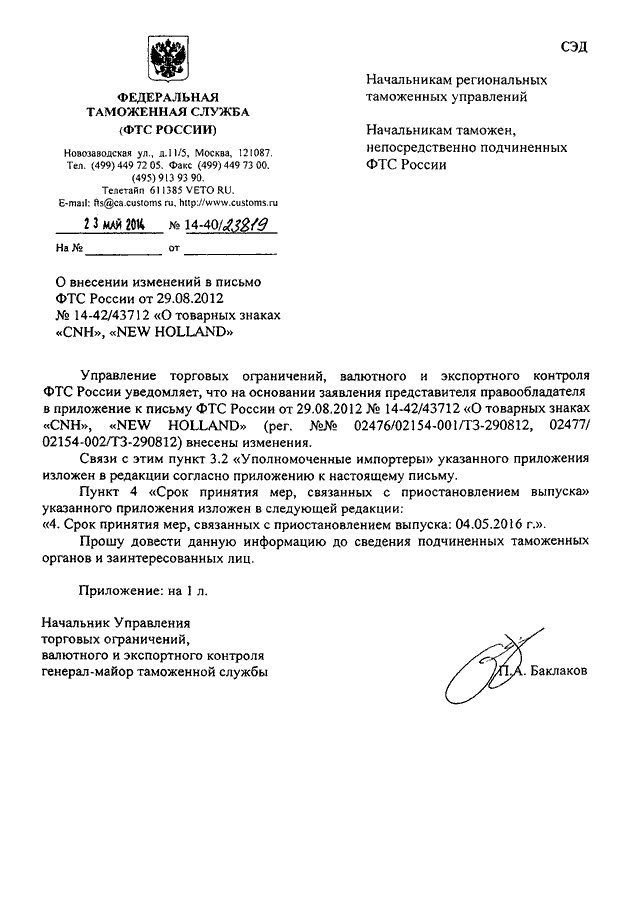 "О ВНЕСЕНИИ ИЗМЕНЕНИЙ В ПИСЬМО ФТС РОССИИ ОТ 29.08.2012 N 14-42/43712 "О ТОВАРНЫХ ЗНАКАХ "CNH", "NEW HOLLAND"