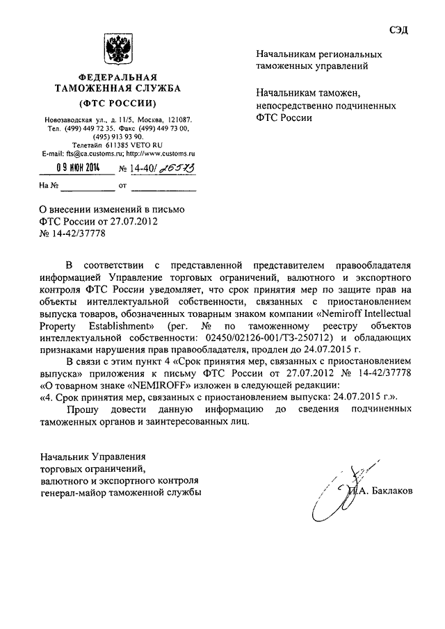 "О ВНЕСЕНИИ ИЗМЕНЕНИЙ В ПИСЬМО ФТС РОССИИ ОТ 27.07.2012 N 14-42/37778"