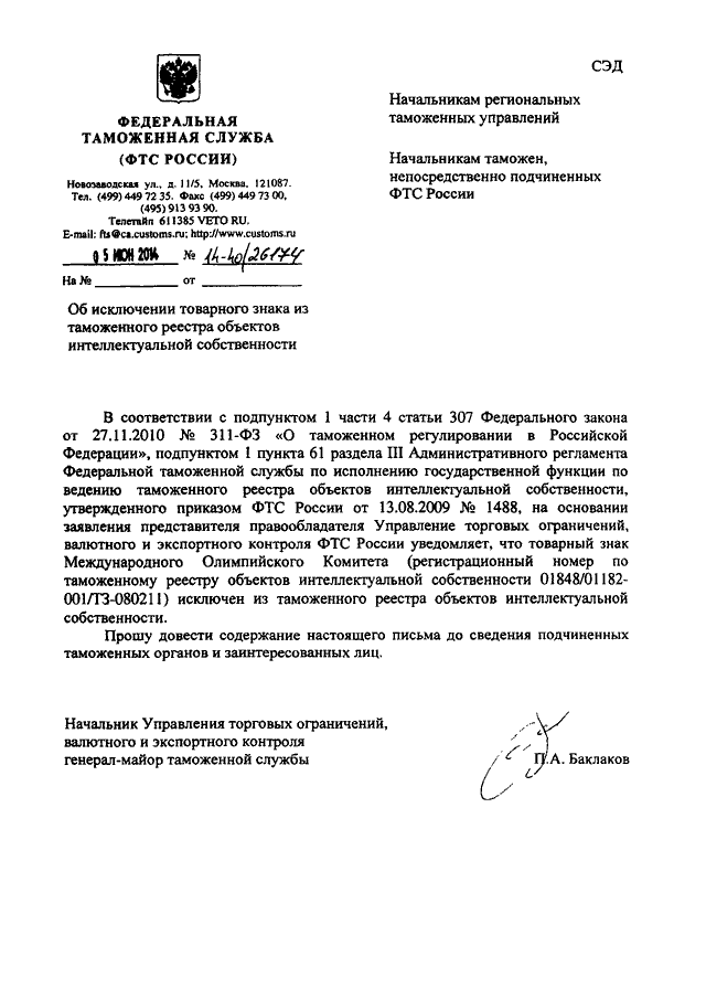ПИСЬМО ФТС РФ от 05.06.2014 N 14-40/26174