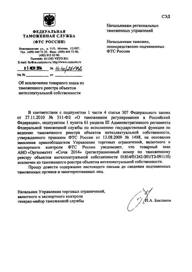 "ОБ ИСКЛЮЧЕНИИ ТОВАРНОГО ЗНАКА ИЗ ТАМОЖЕННОГО РЕЕСТРА ОБЪЕКТОВ ИНТЕЛЛЕКТУАЛЬНОЙ СОБСТВЕННОСТИ"