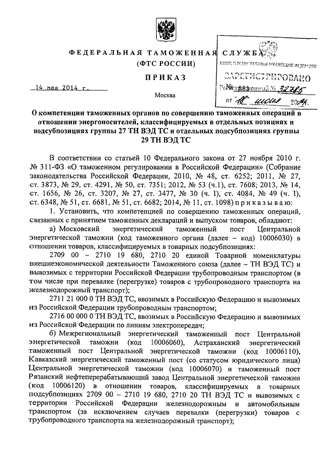 ПРИКАЗ ФТС РФ от 14.05.2014 N 881
