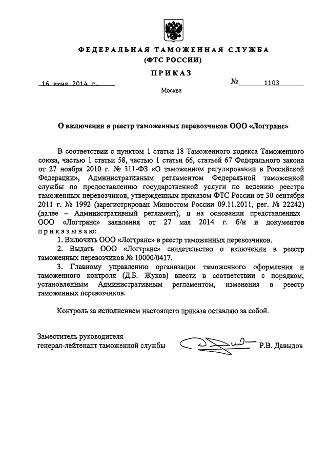"О ВКЛЮЧЕНИИ В РЕЕСТР ТАМОЖЕННЫХ ПЕРЕВОЗЧИКОВ ООО "ЛОГТРАНС"