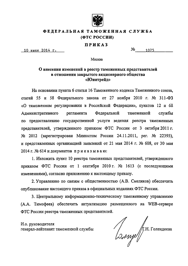 ПРИКАЗ ФТС РФ от 10.06.2014 N 1075