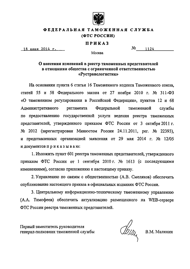 ПРИКАЗ ФТС РФ от 18.06.2014 N 1124