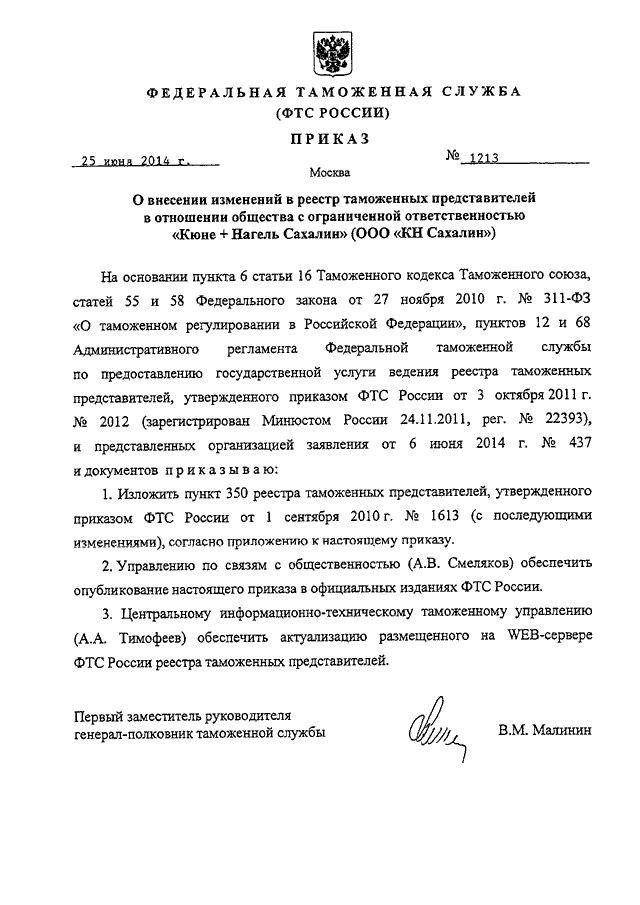 ПРИКАЗ ФТС РФ от 25.06.2014 N 1213