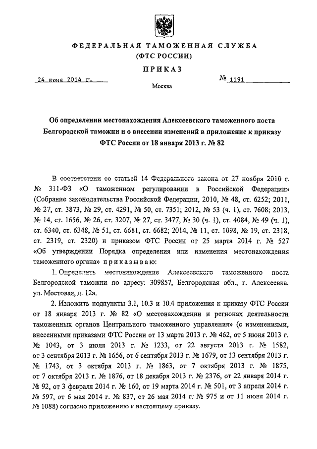 "ОБ ОПРЕДЕЛЕНИИ МЕСТОНАХОЖДЕНИЯ АЛЕКСЕЕВСКОГО ТАМОЖЕННОГО ПОСТА БЕЛГОРОДСКОЙ ТАМОЖНИ И О ВНЕСЕНИИ ИЗМЕНЕНИЙ В ПРИЛОЖЕНИЕ К ПРИКАЗУ ФТС РОССИИ ОТ 18 ЯНВАРЯ 2013 Г. N 82"