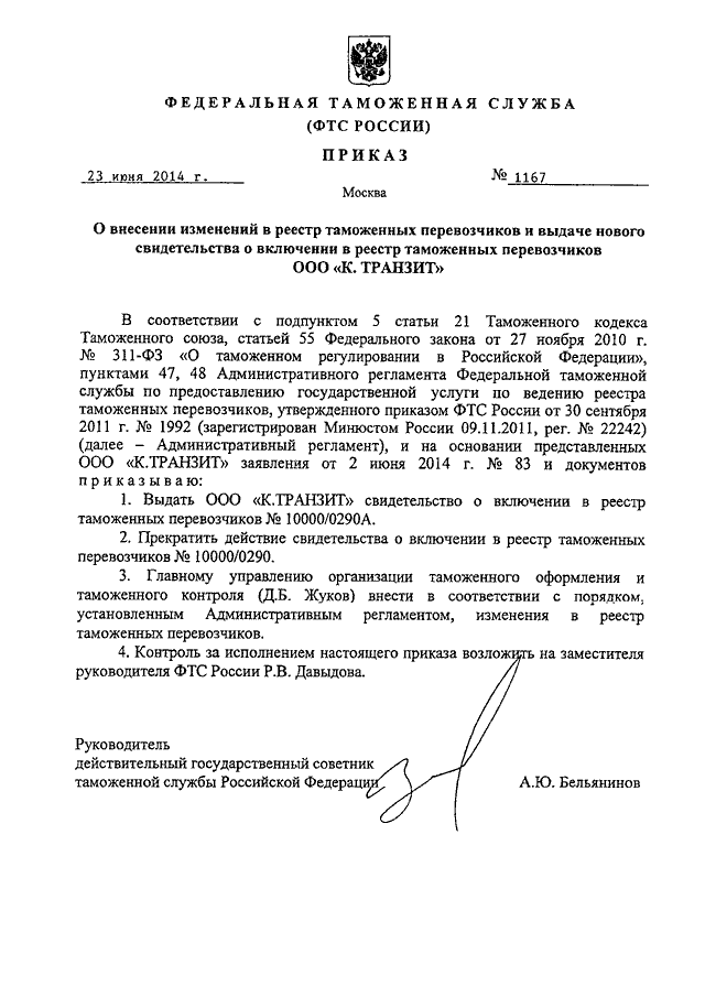ПРИКАЗ ФТС РФ от 23.06.2014 N 1167
