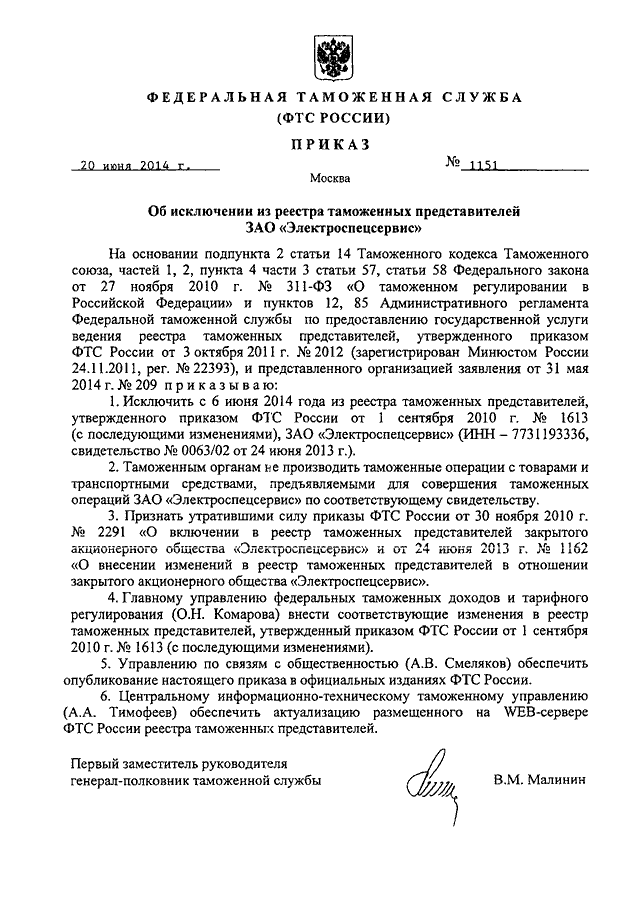ПРИКАЗ ФТС РФ от 20.06.2014 N 1151