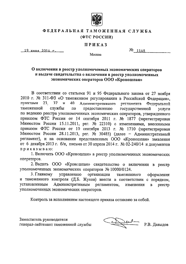 "О ВКЛЮЧЕНИИ В РЕЕСТР УПОЛНОМОЧЕННЫХ ЭКОНОМИЧЕСКИХ ОПЕРАТОРОВ И ВЫДАЧЕ СВИДЕТЕЛЬСТВА О ВКЛЮЧЕНИИ В РЕЕСТР УПОЛНОМОЧЕННЫХ ЭКОНОМИЧЕСКИХ ОПЕРАТОРОВ ООО "КРОНОШПАН"