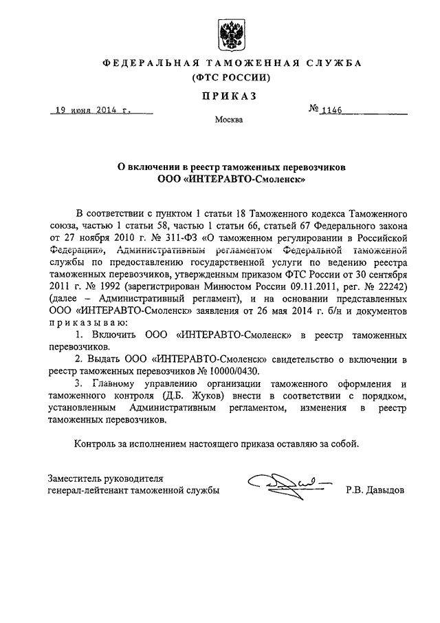 "О ВКЛЮЧЕНИИ В РЕЕСТР ТАМОЖЕННЫХ ПЕРЕВОЗЧИКОВ ООО "ИНТЕРАВТО - СМОЛЕНСК"