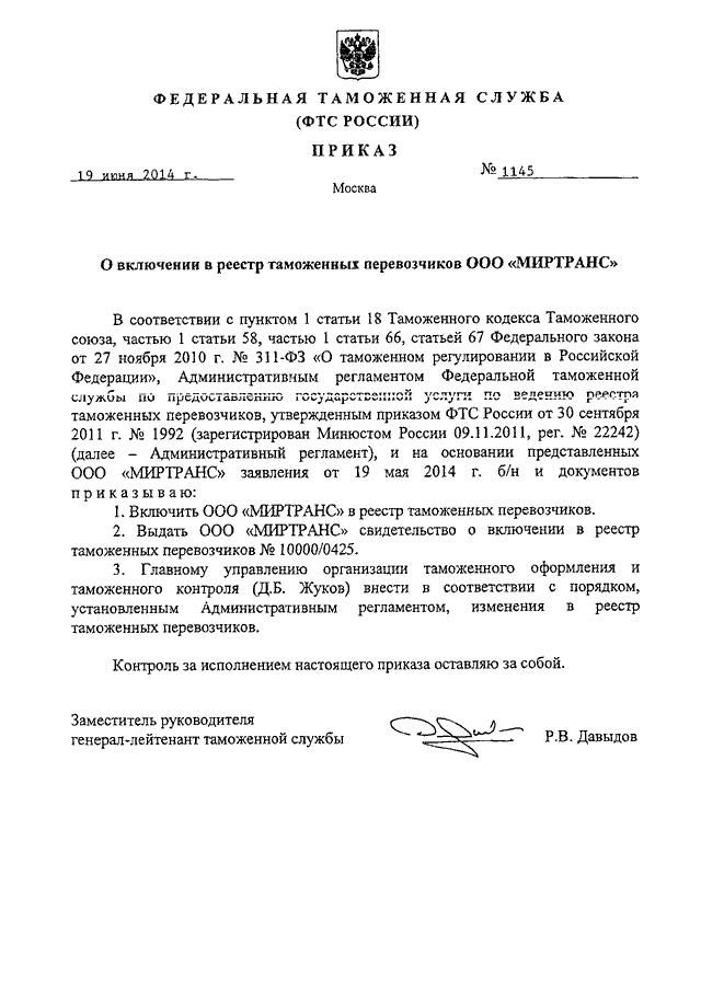 "О ВКЛЮЧЕНИИ В РЕЕСТР ТАМОЖЕННЫХ ПЕРЕВОЗЧИКОВ ООО "МИРТРАНС"
