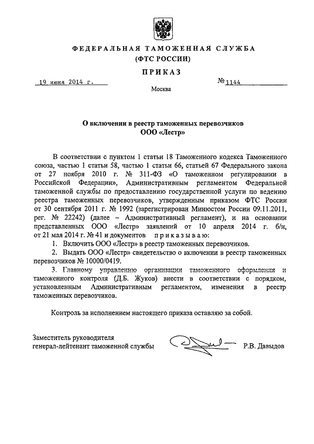 "О ВКЛЮЧЕНИИ В РЕЕСТР ТАМОЖЕННЫХ ПЕРЕВОЗЧИКОВ ООО "ЛЕСТР"