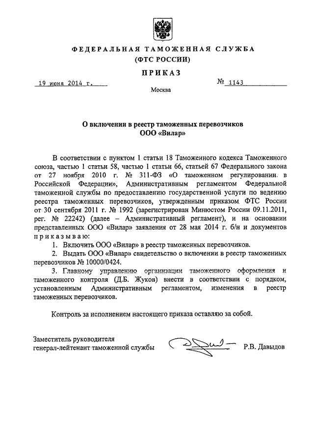 "О ВКЛЮЧЕНИИ В РЕЕСТР ТАМОЖЕННЫХ ПЕРЕВОЗЧИКОВ ООО "ВИЛАР"