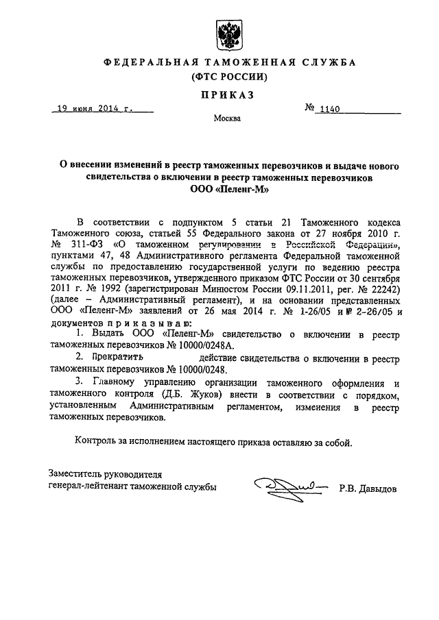 "О ВНЕСЕНИИ ИЗМЕНЕНИЙ В РЕЕСТР ТАМОЖЕННЫХ ПЕРЕВОЗЧИКОВ И ВЫДАЧЕ НОВОГО СВИДЕТЕЛЬСТВА О ВКЛЮЧЕНИИ В РЕЕСТР ТАМОЖЕННЫХ ПЕРЕВОЗЧИКОВ ООО "ПЕЛЕНГ-М"