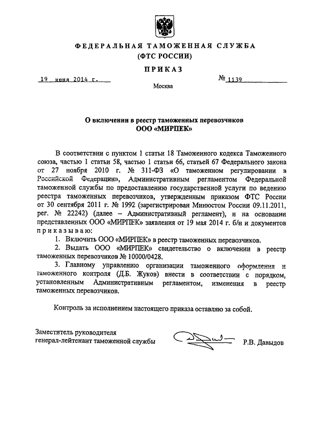 ПРИКАЗ ФТС РФ от 19.06.2014 N 1139
