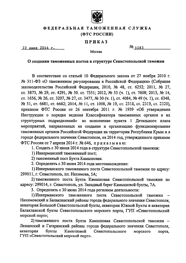 ПРИКАЗ ФТС РФ от 23.06.2014 N 1183