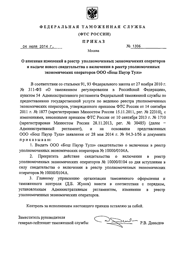 "О ВНЕСЕНИИ ИЗМЕНЕНИЙ В РЕЕСТР УПОЛНОМОЧЕННЫХ ЭКОНОМИЧЕСКИХ ОПЕРАТОРОВ И ВЫДАЧЕ НОВОГО СВИДЕТЕЛЬСТВА О ВКЛЮЧЕНИИ В РЕЕСТР УПОЛНОМОЧЕННЫХ ЭКОНОМИЧЕСКИХ ОПЕРАТОРОВ ООО "БОШ ПАУЭР ТУЛЗ"