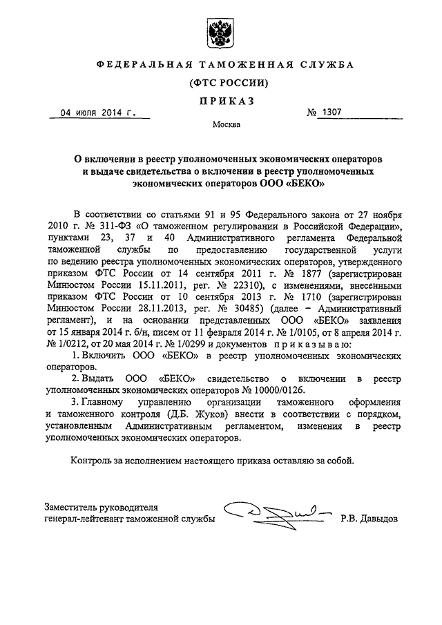 "О ВКЛЮЧЕНИИ В РЕЕСТР УПОЛНОМОЧЕННЫХ ЭКОНОМИЧЕСКИХ ОПЕРАТОРОВ И ВЫДАЧЕ СВИДЕТЕЛЬСТВА О ВКЛЮЧЕНИИ В РЕЕСТР УПОЛНОМОЧЕННЫХ ЭКОНОМИЧЕСКИХ ОПЕРАТОРОВ ООО "БЕКО"